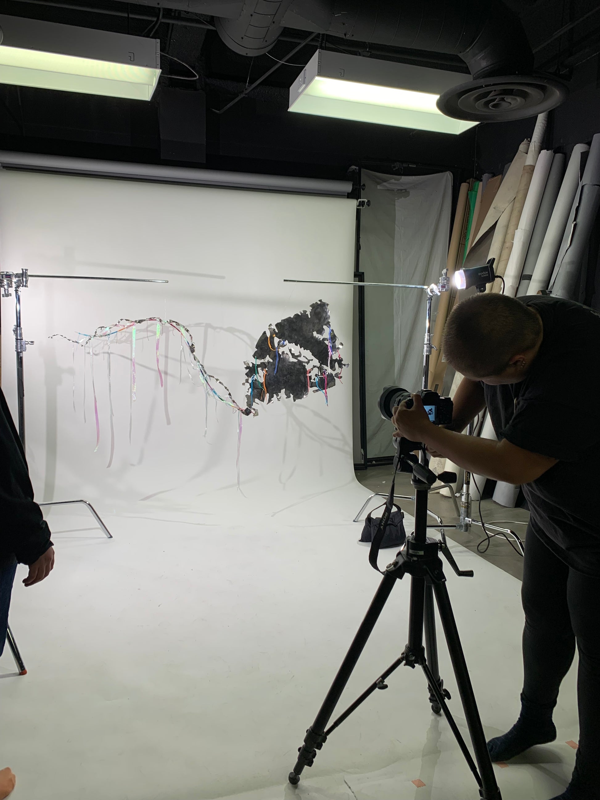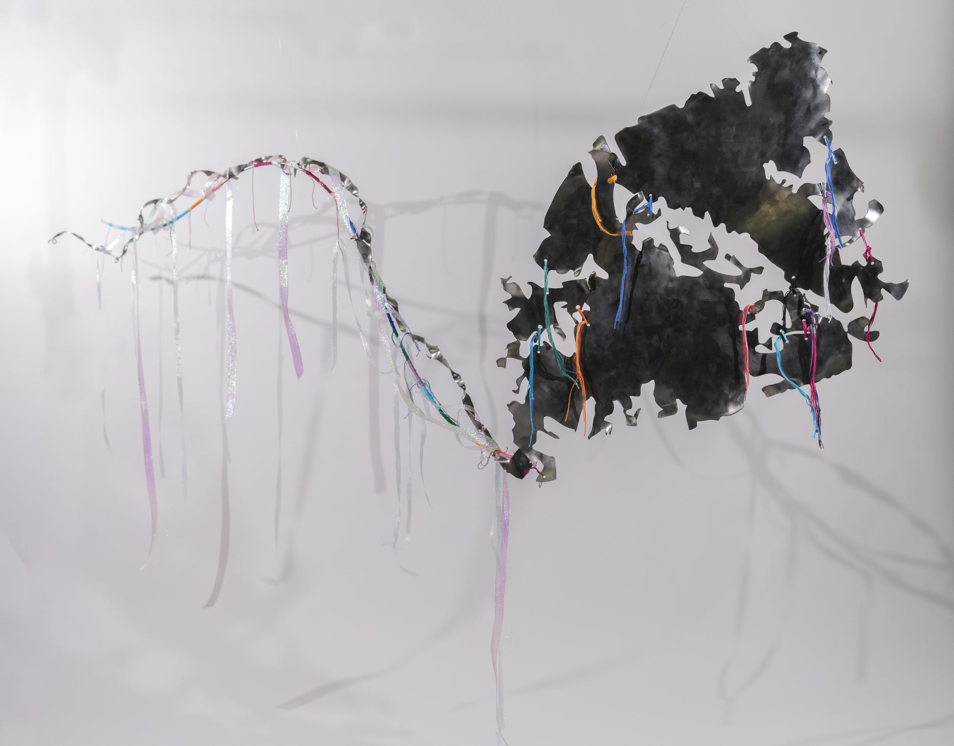 plasma cut, cold formed steel, welded, then sewn together with string.
