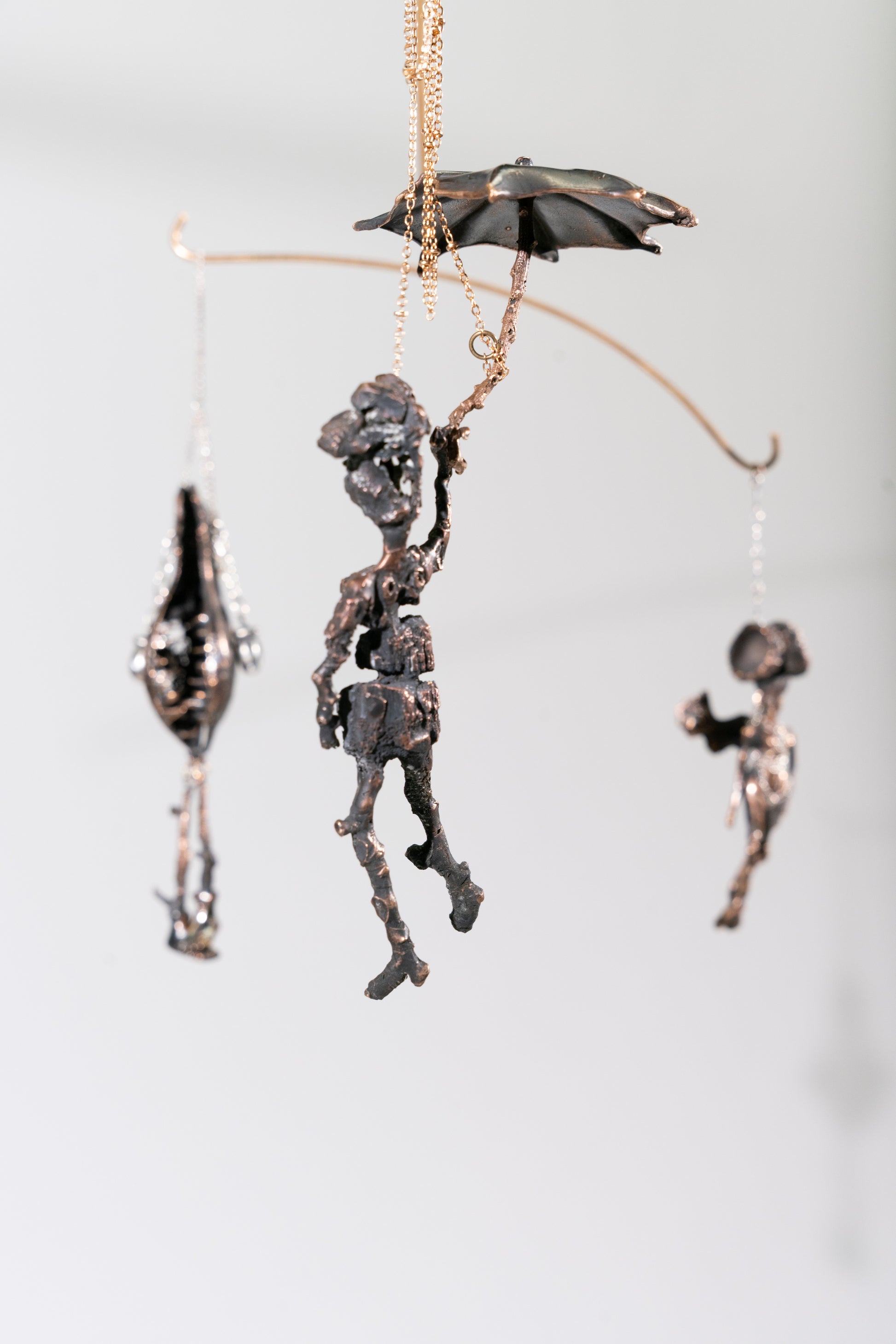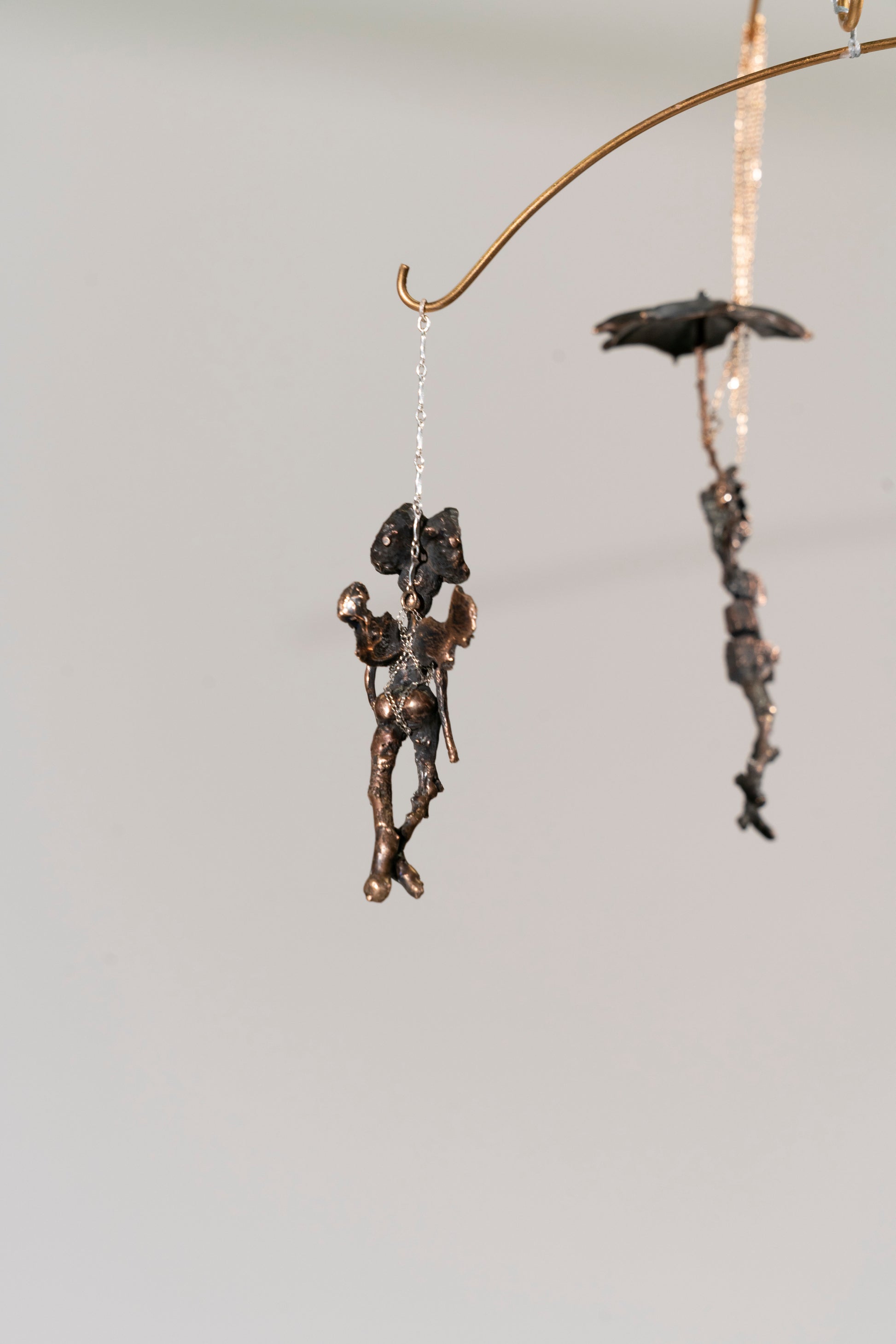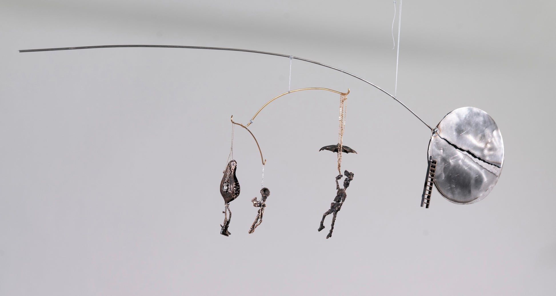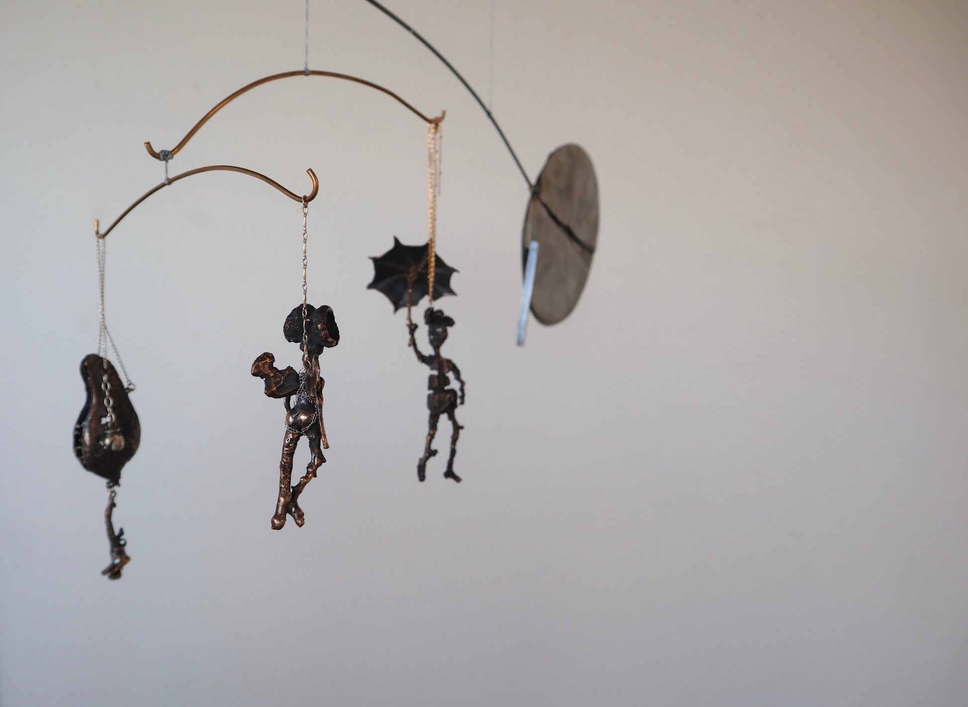 silver, bronze & steel mobile. lost wax cast figurines spin under a plasma cut moon.